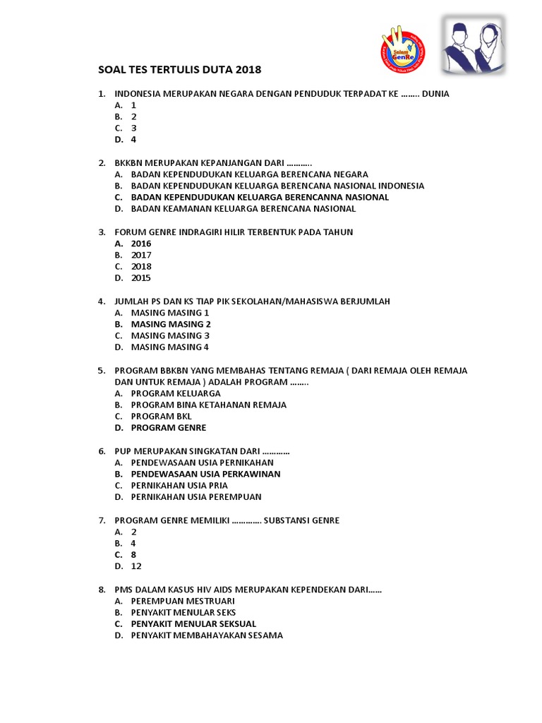 Download Contoh Soal Tes Tulis Duta Genre Terbaru. Kegiatan itu digelar di Gedung Perempuan dan Anak TP PKK Kota Bitung dan ikut dihadiri Kepala Dinas BKKBN Pemkot Bitung dr Franky Soriton. Materi Kobid 2018 KBKR 2.