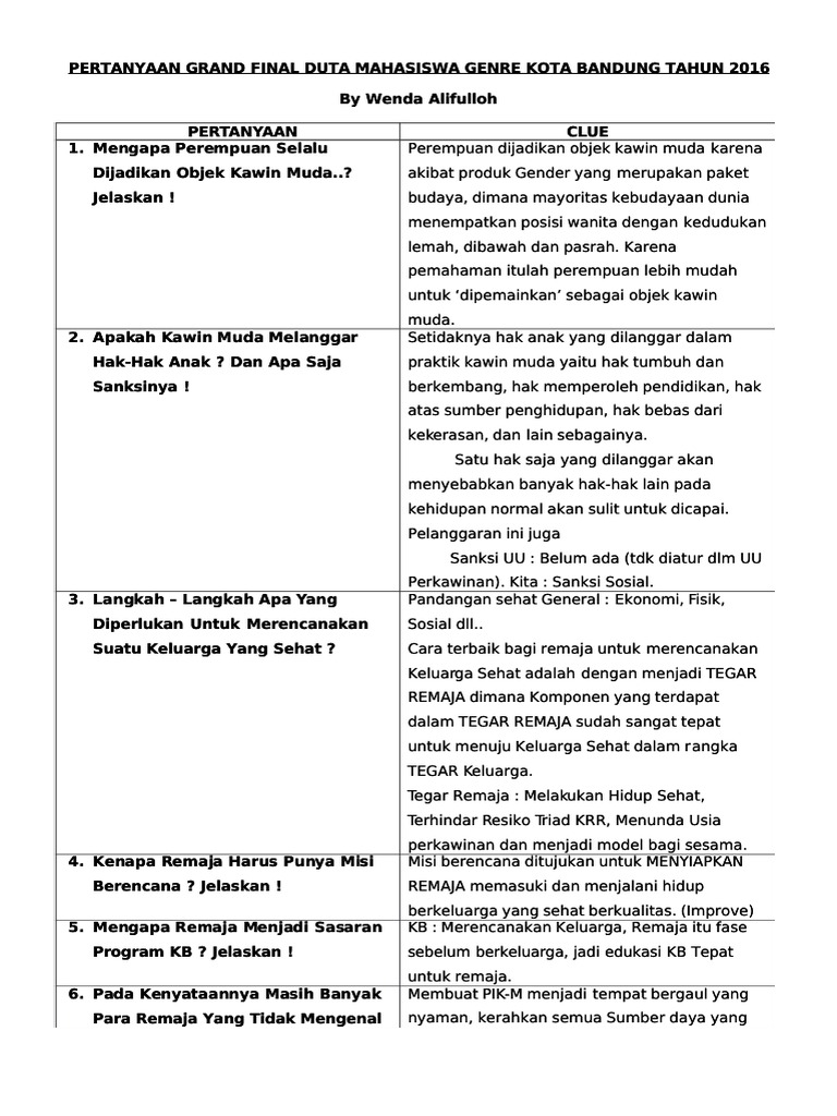 Anda di halaman 1 dari 5. Makanan pokok lauk hewani sayur buah b. PERTANYAAN GRAND FINAL DUTA MAHASISWA GENRE KOTA BANDUNG TAHUN 2016.