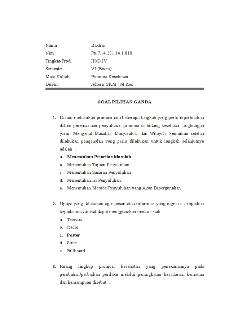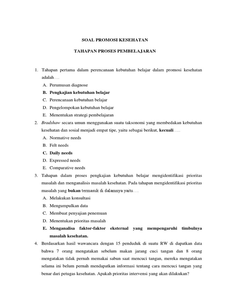 Soal Jawaban Pilihan Ganda - Kelembagaan K3 Contoh Soal Kasus Promosi Kesehatan IlmuSosialid 50 soal pilihan ganda manajemen Promkes komprehensif Contoh Soal Kasus Promosi Kesehatan IlmuSosialid 134354_kumpulan Soal Ukomnas Contoh Soal Kasus Promosi Kesehatan. Inilah contoh soal kasus tentang promosi kesehatan dan informasi lain yang masih ada hubungannya dengan topik contoh soal kasus tentang promosi kesehatan yang Anda cari. Yang dimaksud dengan perilaku kesehatan di bawah ini adalah a.