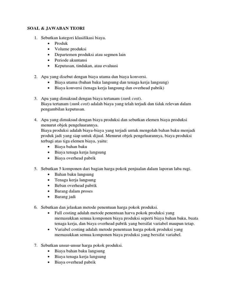 Jawaban Soal Konsep Biaya. Contoh soal singkat akuntansi biaya pt jaya berproduksi sesuai pesanan melalui 3 tiga departemen produksi yaitu departemen 1 2 dan 3. Contoh soal dan jawaban klasifikasi biaya.